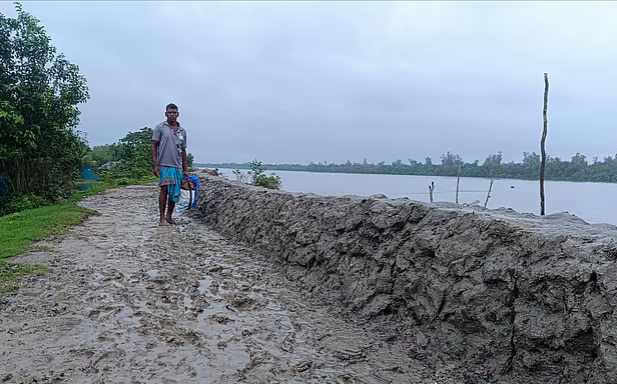 One recent morning, Arvind Kumar was walking along the narrow path above the muddy embankment, carrying a shopping bag. He was carefully stepping into the mud with his shirt rolled up in one hand. As he approached, he smiled and said, “Brother, the river is no longer as calm as it used to be. The tidal water is overflowing the embankment and wants to enter the village. Once it enters, all the houses will be destroyed. That’s why we ourselves have built a wall on this embankment so that no one else can see it.”